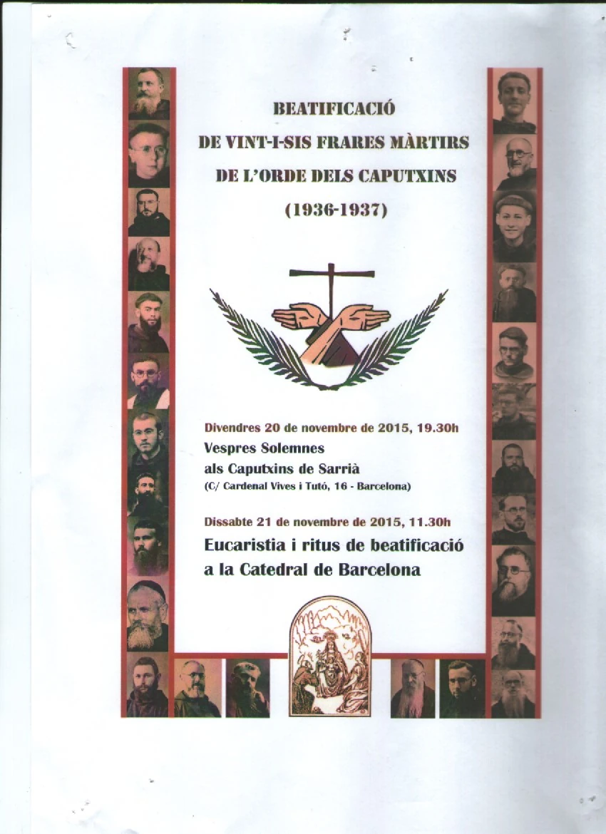 Tra il 20 e il 24 luglio del 1936, praticamente tutti i conventi dei frati della Catalogna, a eccezione di quello di Mallorca rimasto nella zona controllata dal generale Francisco Franco, furono saccheggiati e incendiati. Trentasei frati minori cappuccini, sacerdoti e fratelli laici, trovarono la morte. Tra questi, padre Frederic de Berga, insieme con venticinque confratelli, uccisi in odio alla fede e massacrati tra il 28 luglio 1936 e il 24 febbraio 1937, vengono beatificati, sabato 21 novembre, nella cattedrale di Barcellona. Il rito è presieduto dal cardinale Angelo Amato, prefetto della Congregazione delle cause dei santi, in rappresentanza di Papa Francesco. Le elezioni politiche del 1936, pur premiando ancora una volta le due forze politiche allora esistenti in Catalogna, la sinistra repubblicana catalana e la lega catalana, che avevano tentato di lavorare congiuntamente distanziandosi dai radicali, davano un forte consenso agli anarchici. Una volta scoppiata la guerra il potere di fatto passava dal governo della Repubblica a un comitato di milizie antifasciste sotto il controllo degli anarchici. Fu questo comitato il maggior responsabile della persecuzione sistematicamente organizzata contro gli ecclesiastici. La persecuzione e l’uccisione di preti e religiosi continuò fino al maggio 1937 e lasciò la Chiesa in una situazione di clandestinità fino alla fine della guerra, nel 1939. Le chiese furono chiuse e bruciate e l’identificazione di chiunque come religioso significava la morte senza processo. La popolazione stessa era divisa e la paura portava i cittadini a denunciare ai rivoluzionari qualsiasi individuo sospetto. Allo scoppio della persecuzione le fraternità dei cappuccini erano pronte a inviare i frati nelle case di amici o di conoscenti o parenti che si erano offerti di accoglierli. Tutti i frati avevano tagliato la barba e si erano tolti l’abito per poter uscire dai conventi, non pienamente coscienti del pericolo che correvano. Le difficoltà tuttavia erano grandi, perché non ci si poteva rifugiare dai familiari, per ovvi motivi di sicurezza. Alcuni frati riuscirono a lasciare la Spagna, ma altri rimasti in Catalogna, già dal settembre del 1936 avevano organizzato la Chiesa clandestina, che aveva il permesso papale di celebrare senza paramenti e con arredi sacri impropri. La maggior parte però dei frati cappuccini rimasti in Catalogna furono individuati, alcuni nelle case private, altri furono presi per strada o per l’intervento di persone che li avevano denunciati. Quando venivano scoperti erano semplicemente uccisi sul posto, senza processo, solitamente fucilati. Altri furono anche torturati, contusi con il calcio del fucile, costretti a fare lunghi percorsi con i miliziani sulle spalle, umiliati e poi fucilati. Padre Frederic de Berga era stato guardiano, missionario in America centrale e provinciale per un triennio. All’inizio della rivoluzione era guardiano nel convento di Arenys. Dopo essersi nascosto alcuni giorni sui monti, arrivò a Barcellona e partecipò attivamente alla rete clandestina della Chiesa che si stava formando. Poco prima della morte, nel febbraio 1937, calcolava di aver distribuito, sempre con pericolo di vita, circa 1200 comunioni. Celebrava l’Eucaristica in case private, dove si riunivano piccoli gruppi di fedeli. Fu scoperto e catturato durante una perquisizione nella casa dove era stato accolto. Fra i giovani studenti cappuccini assassinati si evidenzia fra Marçal de Villafranca, il più giovane di quattro fratelli frati. Nato il 16 aprile 1917, fu assassinato il 20 agosto 1936: aveva poco più di diciannove anni. Dopo due perquisizioni dei rivoluzionari che stavano cercando i suoi fratelli maggiori, la famiglia decise di trasferirsi in un altro quartiere, ma una vicina li seguì e li denunciò al comitato di zona. Salutando la mamma, disse: «Mamma, non soffrire per quello che mi può accadere. La mia coscienza è in pace con Dio». Fra Modest de Mieres e fra Ángel de Ferrieres erano un anziano teologo e un giovane frate laico che si rifugiarono nella casa di un altro frate. La casa fu sottoposta a varie perquisizioni, durante le quali essi si fecero passare come parenti della famiglia. Fra Ángel avrebbe potuto scappare, ma non volle abbandonare fra Modest e un altro frate, infermo, allettato. Fra Modest compose una preghiera che insieme recitavano tutti i giorni. Denunciati da alcuni vicini, furono arrestati e assassinati nelle vicinanze del convento. Questi pochi cenni ci aiutano a comprendere il tenore della persecuzione, l’accettazione della morte da parte dei frati, o già fin dal principio o anche dopo aver cercato di evitarla o ancor più dopo aver capito che era inevitabile.